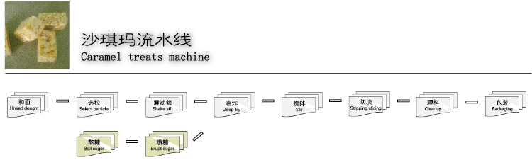 • Caramel treats producing line: 1. Make the dough, 2.ferment 3. Press 4.dusting wheat flour 5. Frying 6.boil sugar 7. spray sugar and mix 8. lift the materials 9. cut 10. arrange and pack